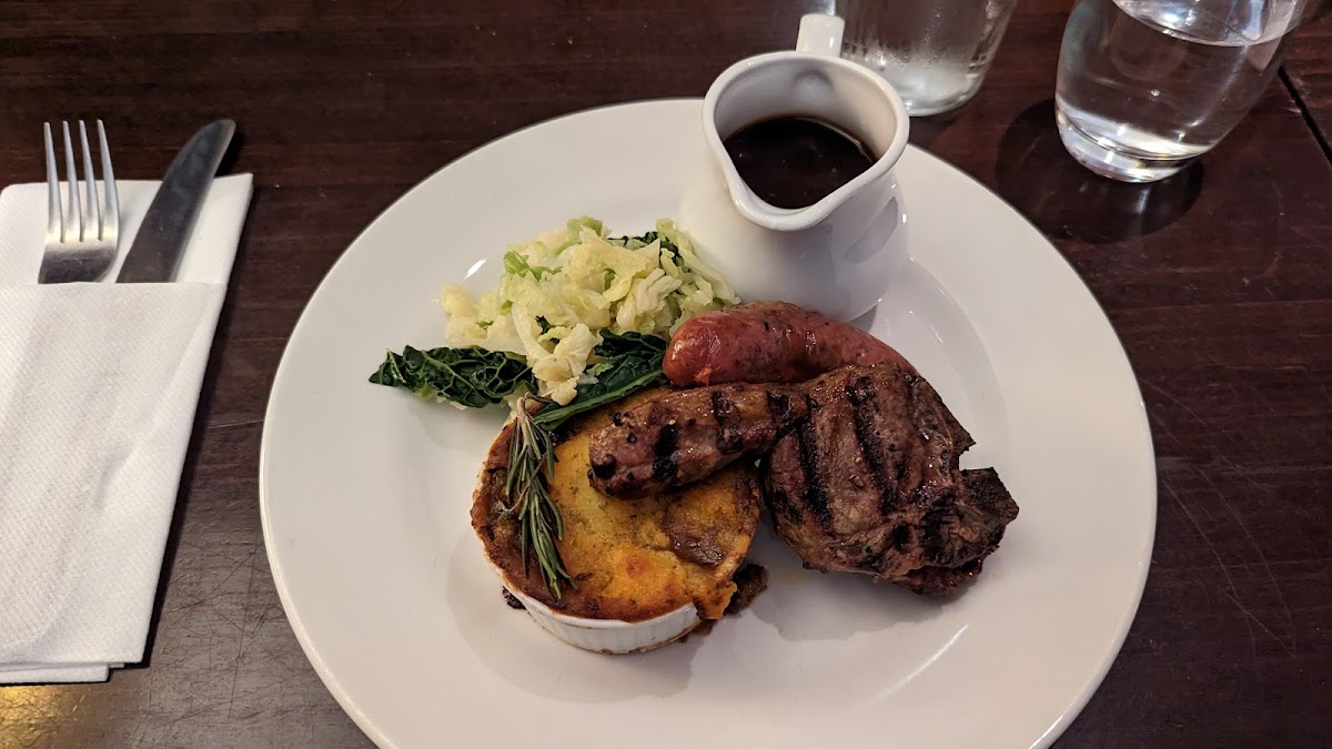 Trio of Lamb Cottage Pie Loin & Sausage with Savoy Cabbage and Port Wine Jus